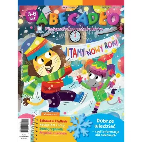 Witamy Was w styczniowym, noworocznym numerze „Abecadła”. Gotowi na spotkanie z Nowym Rokiem? To wspaniale! Styczeń to szczególny miesiąc – obfituje w wiele ważnych wydarzeń… Sprawdźcie, jakie ważne daty czekają na nas w tym miesiącu – s. 1. Co jeszcze w „Abecadle”? Dla tych, którzy uczą się czytać, jest historyjka z Zuzią i Leonem (s. 2) oraz zabawa w czytanie (s. 3). Dowiecie się również, za kogo przebrały się przedszkolaki z leśnego przedszkola i dlaczego Zdziś nie chciał być wilkiem (s. 4-5). Poćwiczycie pisanie liter A i M (s. 8-9), poznacie cyfry 1 i 2 (s. 10-11) oraz angielskie słówka (s. 18-19). Znajdziecie szlaczki (s. 6) oraz kolorowankę (s. 7). Mali detektywi poszukają na stronach „Abecadła” karnawałowych masek, a wszystkie przedszkolaki wzbogacą swoją wiedzę o świecie (s. 12-13). Poćwiczycie również poprawną wymowę (s. 20), znajdziecie zimową piosenkę (s. 21) i poznacie odpowiedzi na ciekawe pytania (s. 22). Poza tym, jak zawsze czekają na Was łamigłówki (s. 14-17). Zapraszamy do udziału w naszych konkursach: plastycznym (s. 23) i całorocznym (s. 24). Uczcie i bawcie się z nami!