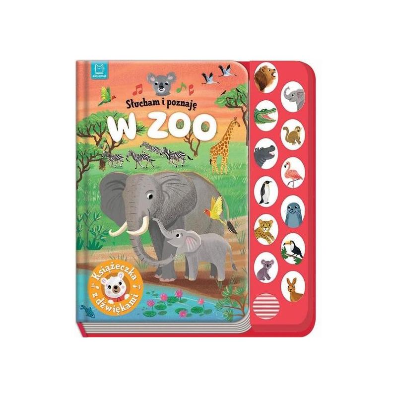 Książka dla małych miłośników zwierząt, a w niej bogate i staranne ilustracje oraz wierszowane historyjki o zwierzakach z zoo. Dodatkową niespodzianką dla dzieci są dołączone dźwięki. Posłuchaj, jak brzmią: lew, słoń, krokodyl, małpka, hipopotam, flaming, pingwin, foka, jaguar, tukan, koala i kangur. Naciśnij przycisk z obrazkiem, aby włączyć dźwięk. Chcesz wyłączyć? Naciśnij przycisk jeszcze raz. Zabawa z książką rozwija zmysły malucha. Wesołe i łatwe do zapamiętania wierszyki rozwijają pamięć i percepcję dziecka, które wzbogaca również swoją wiedzę o odgłosy wydawane przez pokazane w książce zwierzęta. Twarda oprawa i kartonowe karty sprawiają, że książka jest trwała i bezpieczna, a format odpowiedni dla małego dziecka. Do czytania, słuchania i oglądania!