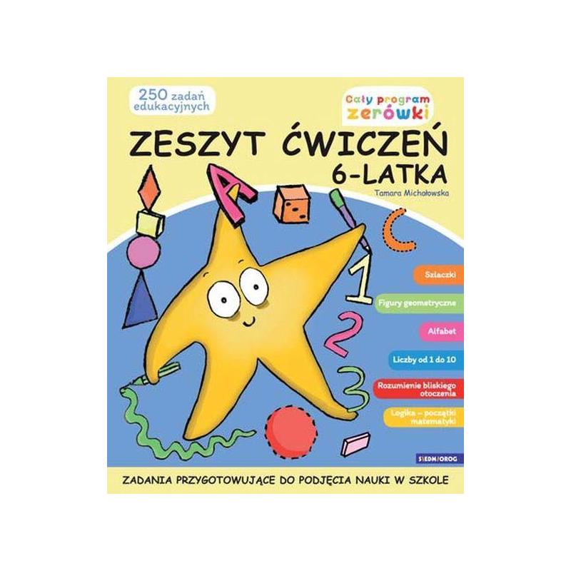 Zeszyt ćwiczeń 6-latka został opracowana zgodnie z podstawą programową do pracy dydaktycznej w przedszkolu. Książka zawiera kilkaset ćwiczeń i zadań edukacyjnych, przygotowujących dziecko do rozpoczęcia nauki w szkole. Książka podzielona jest na sześć rozdziałów tematycznych. Metodą atrakcyjnych kolorowanek edukacyjnych i ćwiczeń aktywizujących, ta wartościowa publikacja przygotuje dziecko do sztuki pisania, nauczy je alfabetu i pozwoli mu odczytywać proste słowa, przybliży mu pojęcie figur geometrycznych, nauczy je liczyć do 10 i dodawać na zbiorach, wreszcie rozwinie w nim umiejętność rozumienia bliskiego otoczenia i logicznego myślenia.