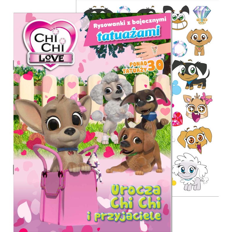 Rysowanki z bajecznymi tatuażami to fantastyczna książka z ulubionymi bohaterami, w której dziecko znajdzie wiele kolorowanek i zadań do wykonania. Do publikacji dołączone są, uwielbiane przez maluchy, zmywalne tatuaże, które wywołają uśmiech na twarzy każdego fana Chi Chi love!