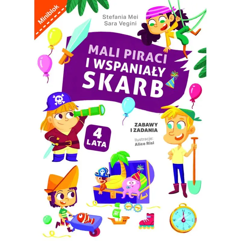 Seria minibloków z zabawami i zadaniami wspomagającymi rozwój dziecka. Aktywności przedstawione w tym bloku – trasy i kształty do narysowania, łączenie i grupowanie elementów, porównywanie zbiorów, rozpoznawanie figur geometrycznych czy dzielenie wyrazów na sylaby – doskonalą grafomotorykę, percepcję wzrokową, umiejętności logiczno-matematyczne, a także kompetencje semantyczne i metafonologiczne. Przejrzysty układ stron z kolorowymi obrazkami oraz proste i zrozumiałe polecenia ułatwią wykonanie zadań. Dziecko razem z piratami wyruszy na poszukiwania skarbu i rozwiąże wiele łamigłówek. Przyklei też na odpowiednich stronach naklejki z drogocennymi przedmiotami oraz pokoloruje znaleziony skarb. Dzięki praktycznemu formatowi książeczka jest idealnym rozwiązaniem zarówno w domu, jak i w podróży!