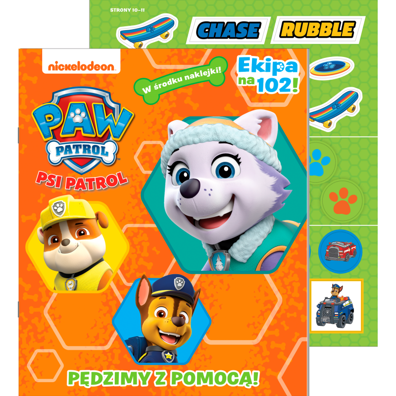 Psi patrol. Ekipa na 102! zawiera zagadki, łamigłówki oraz kolorowanki z ulubionymi bohaterami w roli głównej. W środku również kolorowe naklejki z dzielnymi pieskami! Rezolutne szczenięta Marshall, Rubble, Chase, Rocky, Zuma i Skye oraz dziesięcioletni chłopiec Ryder nigdy nie odmówią pomocy potrzebującym-pomagaj pieskom w ich bohaterskiej