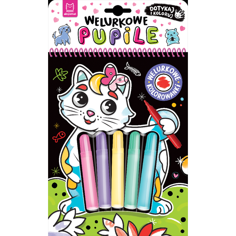 „Welurkowe pupile” to kolorowanka sensoryczna z dołączonymi pisakami. Tło obrazków pokrywa czarny welur, który podkreśla głębię kolorów, zapewnia wrażenia sensoryczne i ogranicza wychodzenie poza linię. Dzięki perforacji pokolorowaną pracę można oderwać, włożyć do ramki i podarować w prezencie lub ozdobić nią pokój. Książeczki z serii „Welurkowe kolorowanki”:
