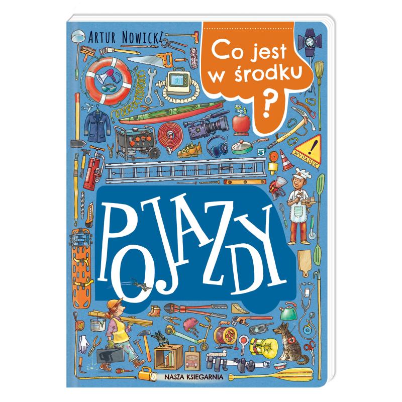 Czy zastanawialiście się kiedyś, ile rzeczy kryją w sobie różne pojazdy, na przykład karetka, wóz reporterski, ponton ratowniczy, pomoc drogowa czy samolot? Ta wypełniona szczegółami książka obrazkowa prezentuje czternaście pojazdów oraz to, co można znaleźć w środku każdego z nich. Czy wiecie, że wóz strażacki przewozi kilka tysięcy litrów wody do gaszenia pożaru, radiowóz – kolczatkę, helikopter pogotowia górskiego – plecak lawinowy, a żaglówka – róg mgłowy? W śmieciarce znajdują się nie tylko śmieci odebrane ze śmietników, lecz także wiele sprzętów. Kiedy coś się zepsuje, można wezwać serwis domowy, w którym przewożonych jest bardzo dużo najróżniejszych narzędzi. Z kolei kamper to dom na kółkach – ile w nim rzeczy potrzebnych na kempingu! Ale na kółkach może być również księgarnia i restauracja. Do book trucka i food trucka trzeba wiele zabrać, aby sprzedawać książki czy przygotowywać i podawać jedzenie. Tę książkę można oglądać godzinami i cały czas odkrywać kolejne szczegóły.