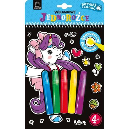 „Welurkowe jednorożce” to kolorowanka sensoryczna z dołączonymi pisakami. Tło obrazków pokrywa czarny welur, który podkreśla głębię kolorów, zapewnia wrażenia sensoryczne i ogranicza wychodzenie poza linię. Dzięki perforacji pokolorowaną pracę można oderwać, włożyć do ramki i podarować w prezencie lub ozdobić nią pokój.