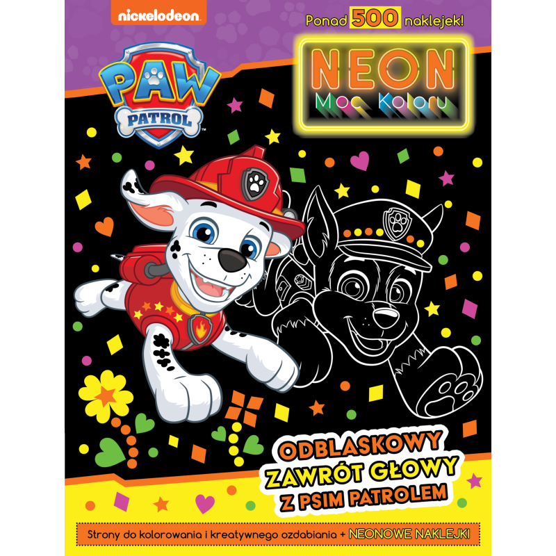 Psi Patrol. Neon Moc Koloru to książka z obrazkami oraz ponad 500 neonowymi naklejkami. W środku dziecko znajdzie strony z obrazkami do kolorowania oraz kreatywnego ozdabiania, dzięki czemu może tworzyć wyjątkowe prace. Każda strona to nowa przygoda z dzielnymi pieskami z Psiego Patrolu, a kolorowanie ulubionych bohaterów i wyklejanie stron neonowymi naklejkami to świetna zabawa.