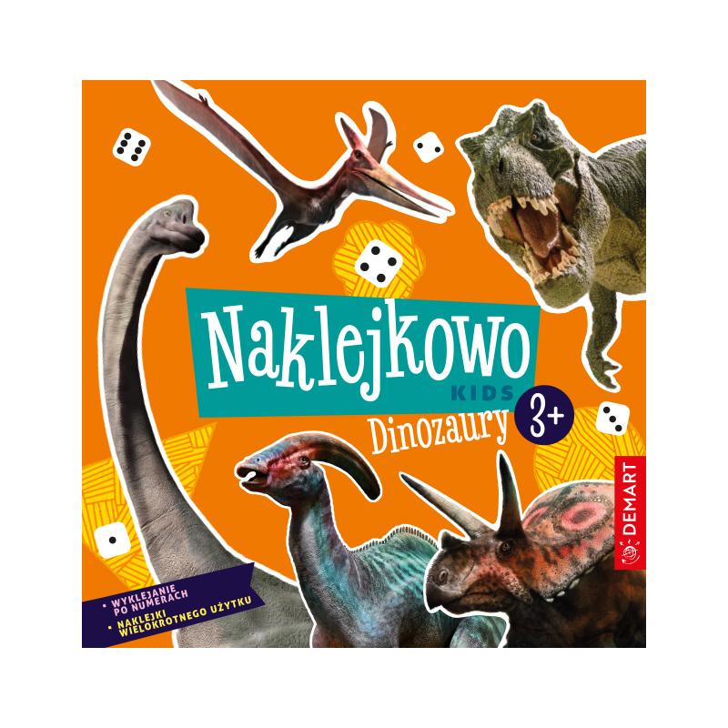 \"Naklejkowo Kids 3+. Dinozaury\" to najnowsza propozycja wydawnictwa Demart skierowana do młodszych przedszkolaków. Dzieci samodzielnie tworzą przepiękne, kolorowe grafiki dinozaurów i prehistorycznych gadów, wyklejając obrazki na 3 poziomach trudności po: