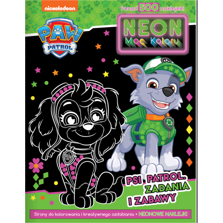 Psi Patrol. Neon Moc Koloru to książka z obrazkami oraz ponad 500 neonowymi naklejkami. W środku dziecko znajdzie strony z obrazkami do kolorowania oraz kreatywnego ozdabiania, dzięki czemu może tworzyć wyjątkowe prace.