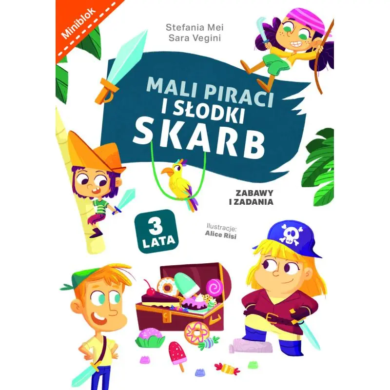 Seria minibloków z zabawami i zadaniami wspomagającymi rozwój dziecka. Aktywności przedstawione w tym bloku – trasy i kształty do narysowania, łączenie i grupowanie elementów, porównywanie zbiorów czy rozpoznawanie figur geometrycznych – doskonalą grafomotorykę, percepcję wzrokową, umiejętności logiczno-matematyczne, a także kompetencje semantyczne. Przejrzysty układ stron z kolorowymi obrazkami oraz proste i zrozumiałe polecenia ułatwią wykonanie zadań. Dziecko razem z piratami wyruszy na poszukiwania słodkiego skarbu i rozwiąże wiele łamigłówek. Przyklei też na odpowiednich stronach naklejki ze słodyczami oraz pokoloruje znaleziony skarb. Dzięki praktycznemu formatowi książeczka jest idealnym rozwiązaniem zarówno w domu, jak i w podróży!