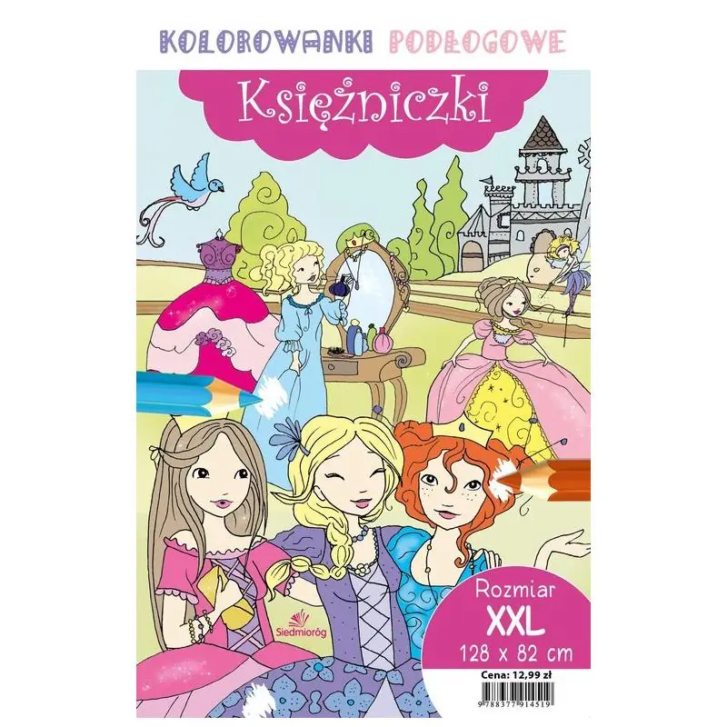 Ten ogromny plakat do kolorowania zaprasza dzieci, a zwłaszcza dziewczynki w wieku 3–6 lat do spędzenia wspólnych chwil z przyjaciółmi lub rodzicami w świecie księżniczek. Spotkanie z księżniczkami można rozpocząć od wizyty w ich pałacach, gdzie można odwiedzić garderobę i poznać tajemnice strojów. Następnie można zobaczyć pojazdy, którymi jeździły i wciąż jeżdżą księżniczki, zatańczyć z księżniczkami na balu, poznać ich przyjaciół, wrogów i ulubione zwierzęta. Plakat przedstawia też księżniczki w czasach współczesnych – na zawodach konnych, na wystawie psów, podczas lekcji baletu, na koncercie, na pokazie mody i na motocyklu w towarzystwie czarującego księcia.