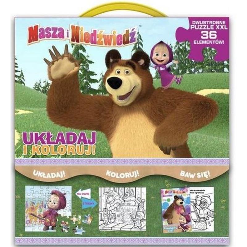 Kartonowa teczka z rączką, która zawiera książkę z kolorowankami i zadaniami oraz dwustronne puzzle do układania i kolorowania.