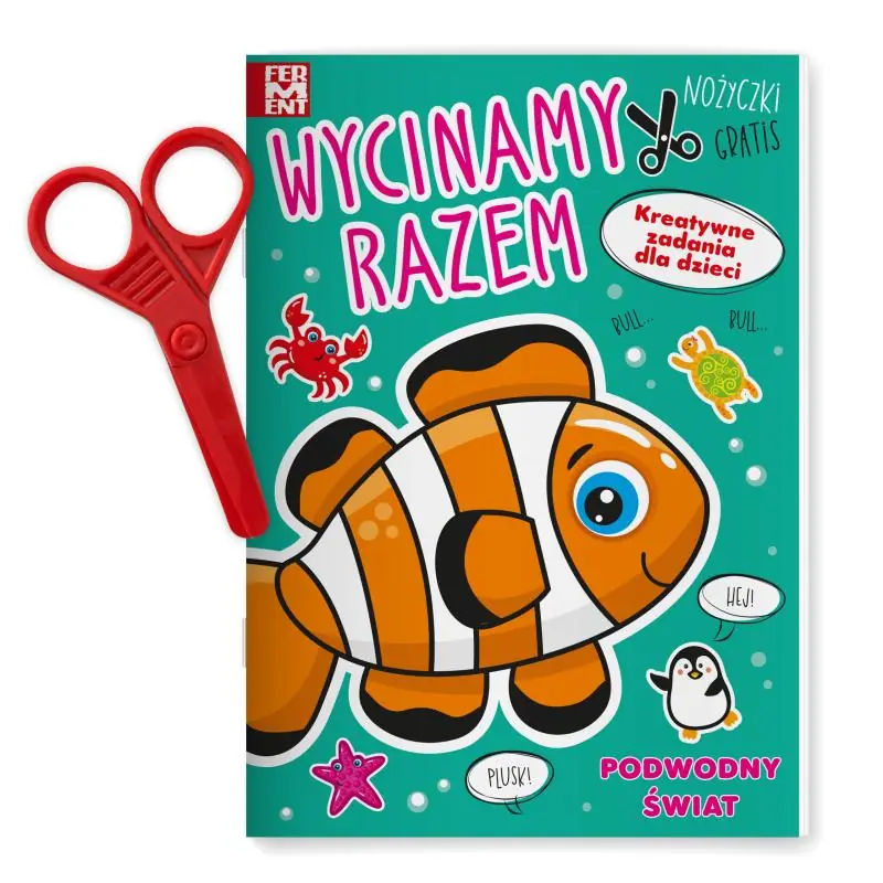 „Wycinamy Razem” to książeczka przeznaczona dla najmłodszych w której maluchy mają za zadanie pokolorować niektóre elementy w książeczce a następnie wyciąć rysunek i posklejać tak aby powstały kolorowe postacie z podwodnego świata. Pamiętaj, że już dwulatek może nauczyć się posługiwać nożyczkami. Oczywiście bezwzględnie nauka musi odbywać się pod kontrolą osoby dorosłej.