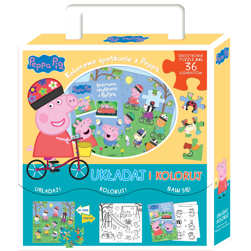 Oto pudełko pełne zabawy ze świnką Peppą! Wewnątrz znajdziesz książeczkę z malowankami oraz dwustronne puzzle. Ułóż obrazek z bohaterami bajki Peppa Pig, a potem odwróć układankę i pokoloruj scenkę według własnego pomysłu.