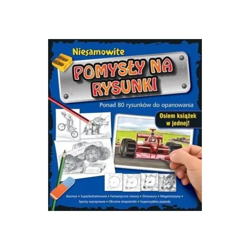 'Niesamowite pomysły na rysunki' to aż 8 książeczek w jednej i ponad 80 rysunków, których może nauczyć się każde dziecko! Książka uczy rysowania za pomocą łatwych wskazówek oraz instrukcji 'krok po kroku'. 'Pomysły' dostarczają podstaw, które budują pewność siebie u młodych artystów. Książka zawiera informacje: z jakich materiałów korzystać, jakie techniki opanować i jakie umiejętności wyćwiczyć.Publikacja jest doskonałą inspiracją dla dzieci, rozwija wyobraźnię i zdolności rysunkowe. Każda książeczka to odrębne pomysły na nowe rysunki! Dzięki zawartym wskazówkom, każde dziecko dowie się w jaki sposób narysować dinozaura, superszybkie pojazdy, superbohaterów czy fantastyczne stwory!