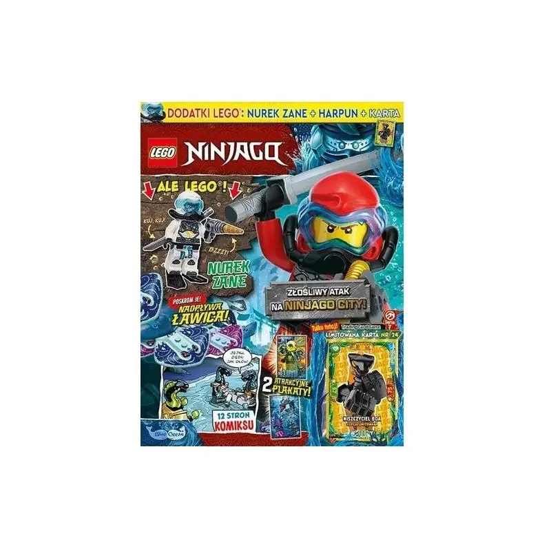 „LEGO NINJAGO + dodatek – gazetka 5/2022 (Nurek Zane + harpun + karta)” to dynamiczny magazyn dla dzieci inspirowany popularną serią LEGO oraz światem LEGO Ninjago. W środku znajdują się pełne akcji komiksy przedstawiające przygody ninja, ciekawostki o bohaterach oraz różnorodne zadania – łamigłówki, quizy i gry rozwijające logiczne myślenie oraz spostrzegawczość. Magazyn zachęca do aktywnej zabawy i pozwala przenieść się do świata walki dobra ze złem. Największą atrakcją numeru jest zestaw dodatków. Do gazetki dołączono figurkę Zane’a w wersji nurka do samodzielnego złożenia, wyposażoną w harpun, który urozmaica zabawę i umożliwia odgrywanie podwodnych misji. Dodatkowo w zestawie znajduje się karta kolekcjonerska, stanowiąca gratkę dla fanów i kolekcjonerów serii.