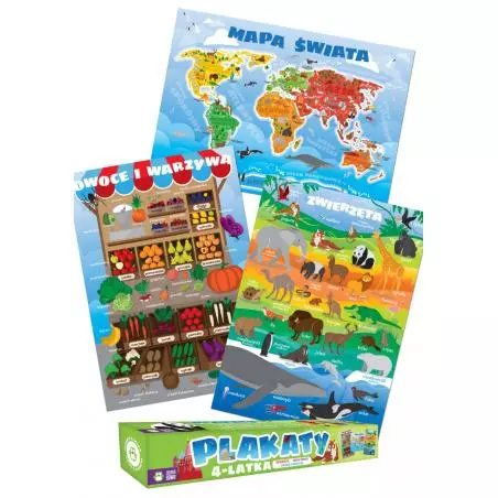 „Plakaty 4-latka” to zestaw zawierający 3 kolorowe, edukacyjne plakaty. Plakaty przedstawiają mapę świata, owoce i warzywa oraz zwierzęta. Ilustracje zachęcają do wyszukiwania szczegółów i systematycznego powtarzania informacji.