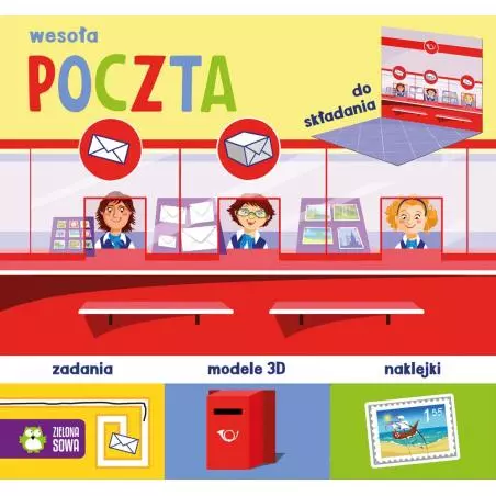 Zaproś dziecko do zabawy! Niech samodzielnie ozdobi wnętrze poczty, warsztatu, restauracji i sklepu. Niech dowie się, jak wygląda praca listonosza i mechanika, poda gościom obiad lub zrobi zakupy u pani Halinki! Seria wesołych książek z ćwiczeniami, naklejkami, wypychankami i modelami 3D, do złożenia przez dziecko bez użycia kleju i nożyczek. Dzięki temu Twój maluch w prosty sposób sam zbuduje scenografię, a następnie ozdobi ją naklejkami i ustawi w niej złożone elementy wnętrza (np. samochód, wózek sklepowy, stół z gośćmi i kelnerem, skrzynkę pocztową). W trakcie zabawy pozna nowe miejsca, rozwiąże ciekawe zadania związane z tematem danej książki oraz rozwinie sprawność manualną i kreatywność.