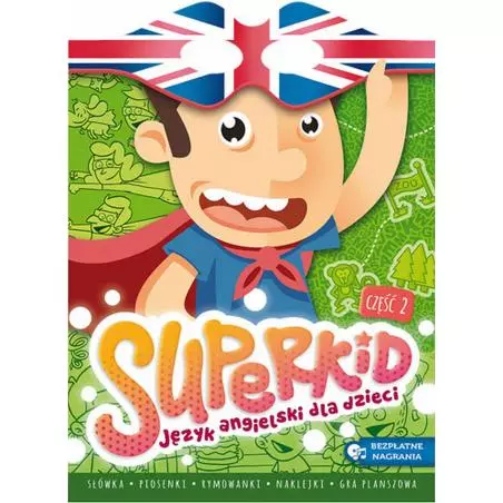 W części II dzieci dowiedzą się, jak się zachować na przyjęciu urodzinowym, poznają nazwy domowych sprzętów i pomieszczeń, zwierząt z zoo oraz sprzętów na placu zabaw. Zadania w tej książeczce wypełnia się, przyklejając naklejki i śpiewając piosenki. Sporo tu rymowanek i prostych, wpadających w ucho komunikatów w języku angielskim. Dużą atrakcją jest utrwalająca słówka gra planszowa na tekturze. W tej części Superkid przeżywa również piracką przygodę! Zapraszamy do zabawy.