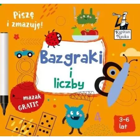 Bazgraki i liczby (3–6 lat) to idealne zabawy do nauki liczenia w zakresie 10. Angażujące zadania graficzne o różnym stopniu trudności doskonalą koordynację oko-ręka, spostrzeganie wzrokowe i grafopercepcję, czyli umiejętności niezbędne w rozwijaniu zdolności matematycznych. Rozwiązując zadania, dziecko przygotowuje się do wyzwań wczesnoszkolnych, m.in. uczy się rozróżniać zapisane liczby, rozumieć pojęcie ilości oraz porównywać liczebność zbiorów. Fascynujący świat liczb Wraz z sympatycznymi Bazgrakami dzieci rozwiązują różnorodne i angażujące zadania graficzne, m.in. rysują cyfry po śladzie, szukają liczb ukrytych w przedmiotach, grają w domino oraz próbują odczytać godzinę na zegarze. W ten sposób stopniowo poznają liczby i odkrywają, że każda z nich to określony zbiór elementów. Zabawy opracowane przez Monikę Sobkowiak, nauczycielkę i neurologopedkę, oraz świetnie zilustrowane przez Polę Augustynowicz sprawiają, że matematyka staje się fascynującą przygodą, podczas której dzieci poznają świat i doskonalą myślenie logiczne. Książka „Bazgraki i liczby” przeznaczona jest do wielokrotnego użytku, ponieważ zamiast zwykłego papieru ma zmywalne karty. Dołączony do niej flamaster suchościeralny pozwala zmazywać odpowiedzi oraz rozwiązywać i poprawiać zadania bez końca. Rozwój nauka liczenia, grafopercepcja, spostrzeganie wzrokowe, koordynacja oko–ręka Autorzy: Monika Sobkowiak – nauczycielka edukacji przedszkolnej, neurologopeda, autorka artykułów, książek i zabaw dla dzieci. Prowadzi blog Pani Monia, inspirującego nauczycieli do innowacyjnego działania w edukacji. Pola Augustynowicz – ilustratorka i projektantka graficzna. Tworzy plakaty, ilustracje do książek i magazynów, wzory na tkaniny oraz ceramikę. W serii również Bazgraki i alfabet Bazgraki w kosmosie Bazgraki w podróży Bazgraki w przedszkolu Bazgraki wśród zwierząt