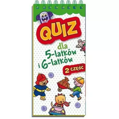 Quiz dla 5-latków i 6-latków 80 obrazkowych zadań dla 52-, 6-latków, w których dziecko wskazuje poprawne odpowiedzi. Poręczny format sprawia, że książeczka doskonale sprawdza się na spacerze, w podróży, w poczekalni i w innych codziennych sytuacjach. Z quizami dziecko uczy się i sprawdza swoją wiedzę!