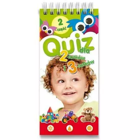Quiz dla 2-latków i 3-latków 80 obrazkowych zadań dla 2-, 3-latków, w których dziecko wskazuje poprawne odpowiedzi. Poręczny format sprawia, że książeczka doskonale sprawdza się na spacerze, w podróży, w poczekalni i w innych codziennych sytuacjach. Z quizami dziecko uczy się i sprawdza swoją wiedzę!