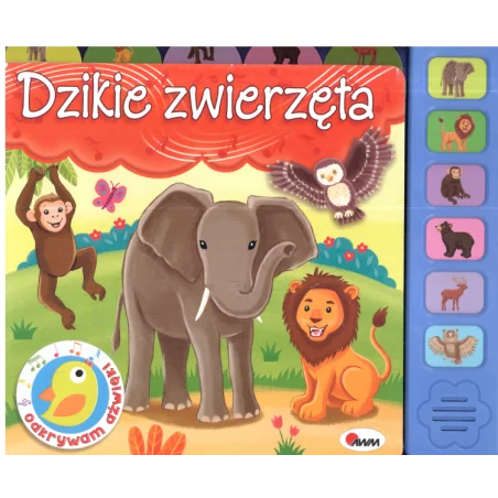 Publikacja zawiera krótkie SCENKI RODZAJOWE, których bohaterami są DZIKIE ZWIERZĘTA. Do każdej historyjki jest dopasowany PRZYCISK DŹWIĘKOWY. Po jego naciśnięciu maluszek usłyszy np. TRĄBIENIE SŁONIA lub RYCZENIE LWA. Atutem książki są również KOLOROWE WYPUSTKI z obrazkami przedstawiającymi zwierzęta. Dzięki nim można łatwo otworzyć książkę na wybranym dźwięku.