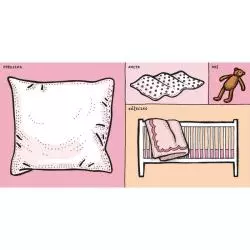 Na kartonowych stronach znajdziecie jedzenie, ubrania, zabawki, wizytę w parku, na placu zabaw i w zoo, kąpiel, części ciała oraz wiele innych rzeczy i zdarzeń bliskich każdemu dziecku.