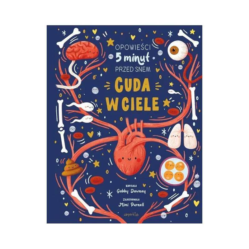 Poczytajmy razem, już opowieść gotowa o twym ciele i cudach, które w sobie chowa! Zainteresowanie ciałem u dzieci to ważny i naturalny etap ich rozwoju. Jak zaspokoić ich ciekawość, dotyczącą trudnej anatomii, w sposób, który byłby zrozumiały dla kilkulatka? Za pomocą uroczych opowieści o sekretach organizmu, które czekają, by je odkryć! „Cuda w ciele” to zbiór opowieści o narządach, tkankach i procesach, dzięki którym działamy. Z ośmiu rozdziałów młodzi czytelnicy dowiedzą się m.in. jak powstali, dlaczego śpią, w jaki sposób oddychają, zwalczają zarazki i myślą, do czego służą ich zmysły, krew, kości oraz mięśnie i jak z jedzenia powstaje kupa. Niezwykłości organizmu zostały przedstawione za pomocą wierszowanych opowieści, a każdy rozdział kończy strona informacyjna z ciekawostkami. Ich autorka, brytyjska pisarka i poetka Gabby Dawnay dowodzi, że dzięki lekkim, melodyjnym rymom i zabawnym porównaniom edukacyjne „Cuda w ciele” nadają się do wieczornego czytania równie dobrze jak bajki! Urocze, roześmiane ilustracje to dzieło australijskiej artystki Mimi Purnell, współautorem przekładu jest znany przyrodnik i popularyzator nauki dr Mikołaj Golachowski, który czuwał również nad poprawnością merytoryczną książki. Książka ma twardą szytą oprawę, okładkę zdobią misterne złocenia. Niebanalna treść, dopracowana szata graficzna i staranność edytorska czynią „Cuda w ciele” wartościową propozycją na prezent dla przedszkolaków i początkujących szkolniaków. Lektura każdej opowiastki zajmie nie dłużej niż pięć minut – to doskonała lektura na wspólny czas z dzieckiem… pięć minut przed snem. W serii ukazały się też: „Cuda w lesie”, tekst: Gabby Dawnay, ilustr. Mona K.