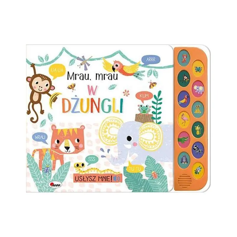 Dzieci znajdą w niej krótkie teksty. Wyróżnikiem publikacji jest aż 12 różnorodnych DŹWIĘKÓW. Dzięki niej maluch dowie się, jakie dźwięki wydają tygrys, krokodyl czy goryl.