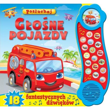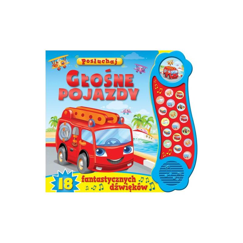 Poznaj hałaśliwe samochody, samoloty i motorówki, które wzięły udział w wielkim wyścigu! Czy umiesz nazwać wszystkie maszyny? Rozpoznasz je po dźwiękach, jakie wydają! Używaj wszystkich 18 guzików, hałasuj do woli i baw się, czytając ciekawe historyjki. Prócz małych guziczków, odtwarzających głosy pojazdów, jest tu jeszcze górny duży panel z wizerunkiem wozu strażackiego - naciśnięty, odtwarza muzyczkę.