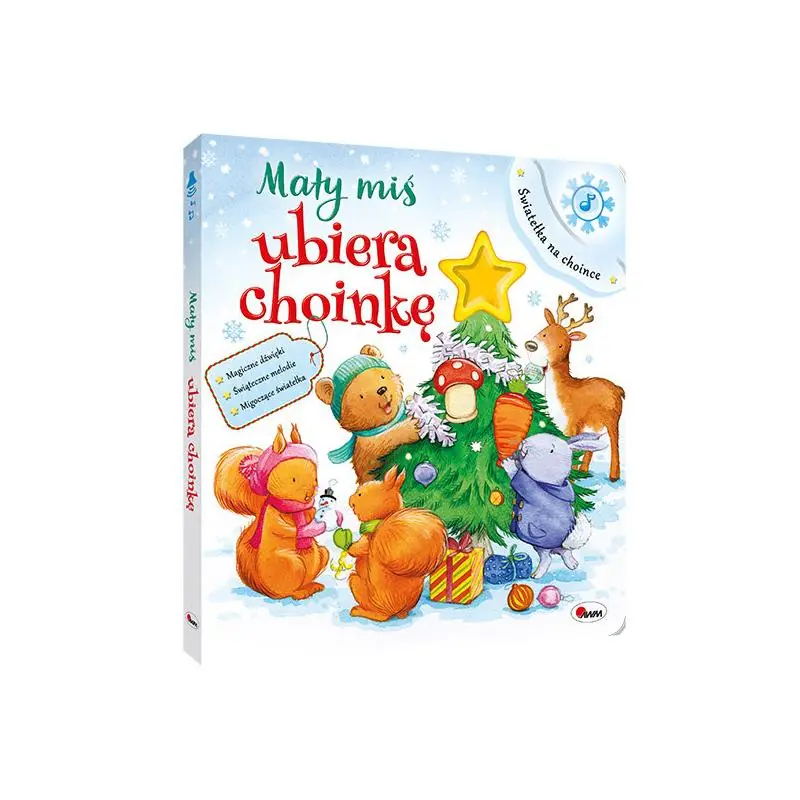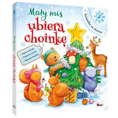 "Książeczka kartonowa z MODUŁEM DŹWIĘKOWYM I ŚWIATEŁKAMI! Do lektury zachęcają SYMPATYCZNE ILUSTRACJE i CIEPŁA OPOWIEŚĆ. Książka wprowadza w magiczny NASTRÓJ Bożego Narodzenia. To piękna, ciepła OPOWIEŚĆ, której bohaterami są MAŁY MIŚ oraz jego przyjaciele ZWIERZĘTA. Historia o przygotowaniach do świąt wzbogacona jest pięknymi, nastrojowymi ILUSTRACJAMI. Pokazuje ona, że PRZYJAŹŃ i WSPÓŁPRACA czynią cuda. Książka wyposażona jest w PRZYCISK DŹWIĘKOWY. Po jego naci-śnięciu maluszek usłyszy kolejno pięć dźwięków oraz świąteczną MELODIĘ. Dodatkowo, po naciśnięciu przycisku zapalają się kolejne LAMPKI NA CHOINCE, a na koniec wszystkie lampki MIGOCZĄ. Książka: • wprowadza w nastrój ŚWIĄT BOŻEGO NARODZENIA • zapoznaje ze ŚWIĄTECZNĄ MELODIĄ • pozwala cieszyć się BLASKIEM CHOINKOWYCH LAMPEK • wspiera WSZECHSTRONNY ROZWÓJ dziecka • rozwija WYOBRAŹNIĘ • wzbogaca SŁOWNICTWO "
