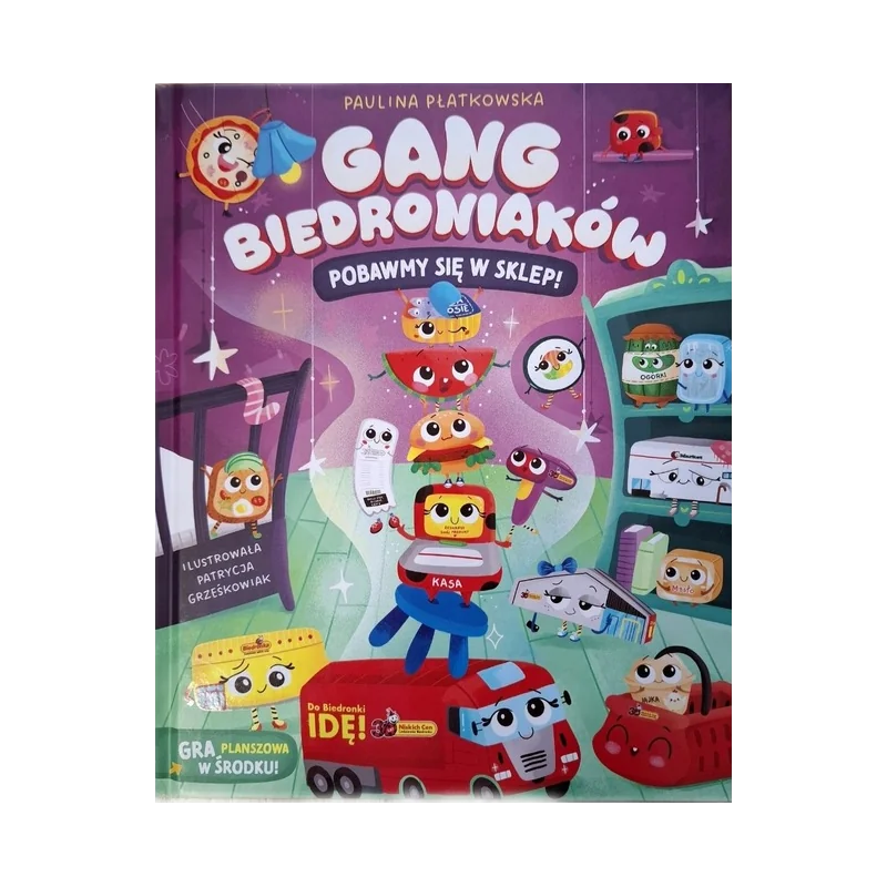 Książeczka dla dzieci pt. "Gang Biedroniaków. Pobawmy się w sklep". Ładnie ilustrowana bajka, twarda oprawa, 46 strony, w książce znajduje się również gra planszowa. Autorka: Paulina Płatkowska.
