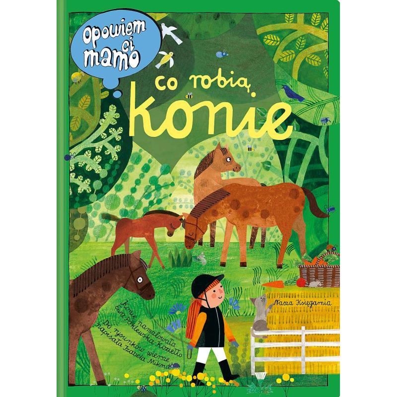 „Opowiem ci, mamo, co robią konie” to wyjątkowa pozycja dla wszystkich małych miłośniczek i miłośników tych pięknych zwierząt. Spotkacie tu konie, kucyki, koniki polskie, rzadkie zebryny oraz zebrule, a także te zupełnie wymyślone: jednorożce czy centaury. Dowiecie się, czym się różni cwał od kłusu i galopu oraz co zapleść z końskiej grzywy. Poznacie mnóstwo końskich maści: w tym szampańską, myszatą i tarantowatą. Zajrzycie też do stajni, by odkryć, w co się ubiera jeździec, jak jest skonstruowane siodło oraz co konie jedzą i jak spędzają wolny czas.