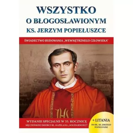 W 2019 roku minie 35 lat od męczeńskiej śmierci bł. ks. Jerzego Popiełuszki. Autor Wacław Stefan Borek stara się wejść w duchowy dialog z kapelanem „Solidarności”, odsłaniając – w myśl zachęty św. Jana Pawła II – jego „wewnętrznego człowieka”, który był świadkiem trudnych czasów dla Polski. Tytuł nawiązujący do serii wydawniczej „Wszystko o”, tym razem nawiązuje więc do wewnętrznego życia, które miało oczywiście swój zewnętrzny wyraz w zapisie biograficznych faktów, decyzji, listów, notatek czy też kazań. Książka „Wszystko o bł. ks. Jerzym Popiełuszce” to przede wszystkim publikacja o tym wszystkim, co było najważniejsze w jego życiu, a najważniejsze było posłuszeństwo Chrystusowemu krzyżowi. Autor pokazuje tę obecność krzyża na różnych etapach życia męczennika. Gdzieś jednak na drugim planie pojawia się w tej książce temat, który można by objąć wspólnym mianownikiem: wszystko o intelektualnej i duchowej przemianie kapelana hutników i pielęgniarek, aż do gotowości na męczeństwo. Ks. Jerzy krzyż trzymał nie tylko fizycznie w czasie Mszy Świętych za Ojczyznę. Trzymał duchowo, kiedy niósł pomoc potrzebującym, zwalnianym z pracy, internowanym. Ten krzyż ucałuje w chwili przeżywania męczeńskiej śmierci niewinnego człowieka, który konsekwentnie realizował postulat św. Pawła by „zło dobrem zwyciężać” (por. Rz 12,21). Krzyż jednak prowadzi do chwały. Zewnętrznym przejawem „zmartwychwstania” bohatera tej książki jest ogromny kult postaci błogosławionego kapłana, szerzący się nie tylko w polskim społeczeństwie, lecz na całym świeci. Nie tylko więc krzyż, ale też i chwała Boża w formie błogosławionych owoców męczeństwa jest ukazana w tej książce. Oprócz intelektualnej zadumy nad postacią ks. Jerzego, na poszczególnych stronach zostały umieszczone wezwania Litanii do bł. ks. Jerzego Popiełuszki. Wezwania odmawiane w formie aktów strzelistych bez wątpienia ułatwią dialog z bohaterem tej publikacji.