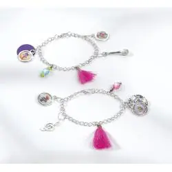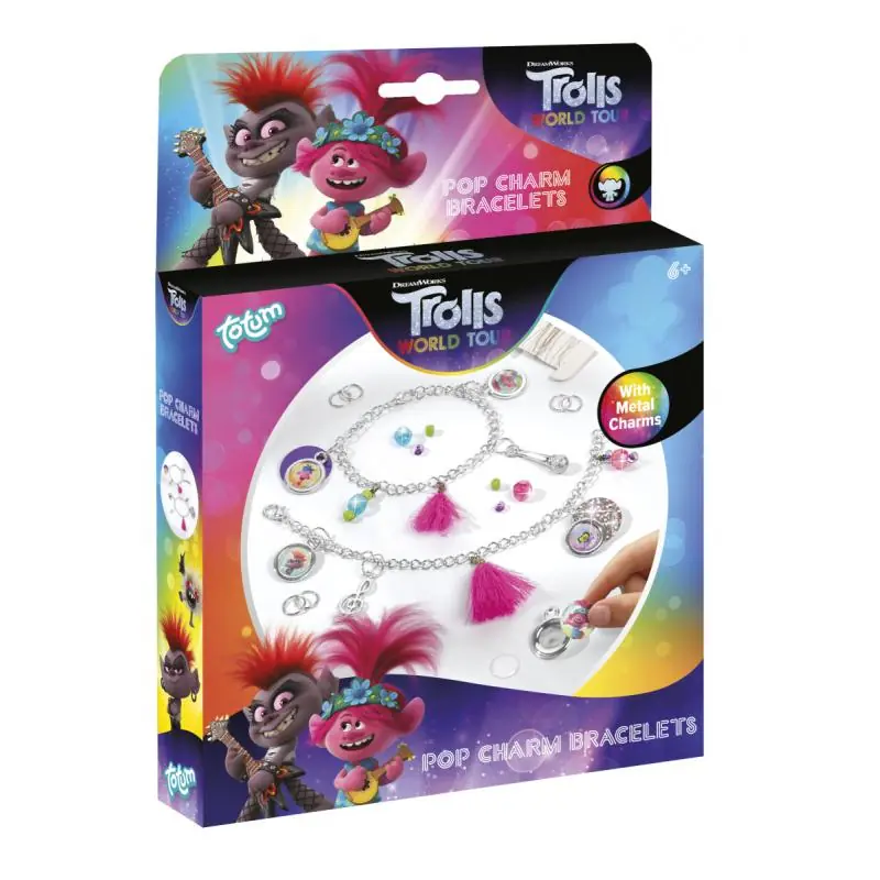 Zawartość: dwa łańcuszki, 4 okrągłe zawieszki (medaliony), 2 figurki zawieszki, naklejki na medaliony, koraliki, gumki do włosów trolla, kółka do mocowania, drut metalowy.