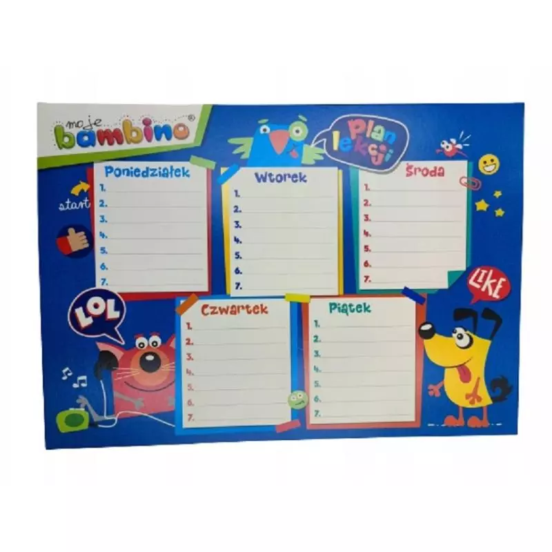 Wybierz papierowy plan lekcji Bambino A4 i pomóż dziecku w codziennej organizacji nauki i zabawy w szkole oraz w domu.