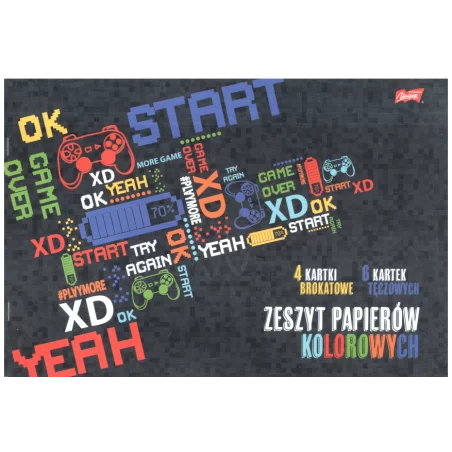 - zeszyt papierów kolorowych zawiera 5 kartek samoprzylepnych fluo, 4 kartkimetalizwane oraz dwie kartki tęczowe