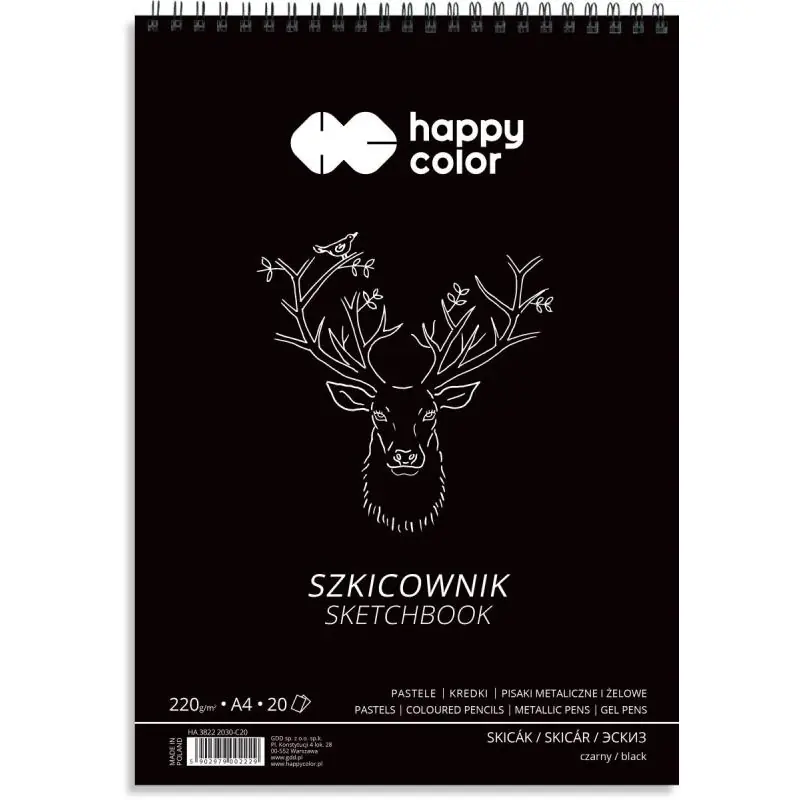Happy Color szkicownik na spirali czarny A4 220g 20 kartek to profesjonalny blok artystyczny przeznaczony do rysunku i szkicowania na ciemnym papierze. Wysoka gramatura 220g oraz czarny papier sprawiają, że szkicownik doskonale nadaje się do pracy z jasnymi i