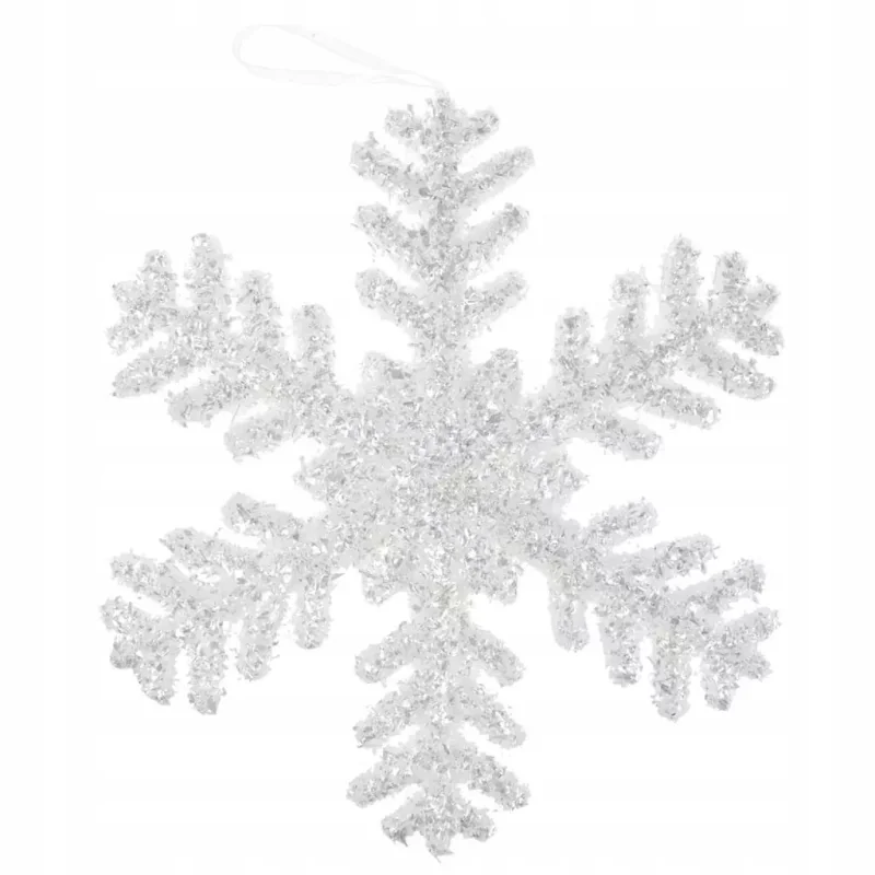 Ozdoba choinkowa śnieżynka brokatowa srebrna 23 cm Arpex to elegancka dekoracja świąteczna, która zachwyca swoim blaskiem i subtelnym wyglądem. Wykonana z lekkiego tworzywa i pokryta drobnym brokatem, pięknie odbija światło lampek choinkowych, tworząc efekt mroźnego, zimowego blasku.