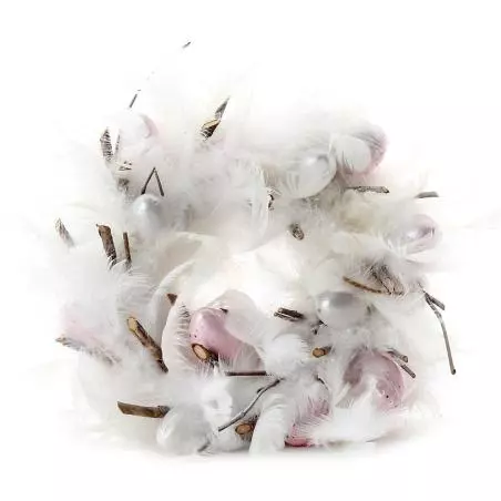 - ozdobiony białymi piórkami, jajeczkami i gałązkami