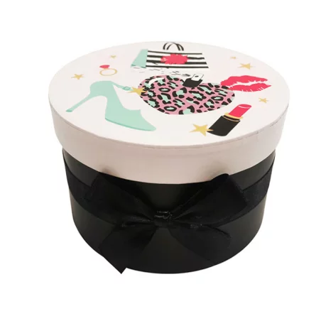 • wzór na wieczku: kobiece gadżety, z czarną wstążką i kokardką wokół korpusu