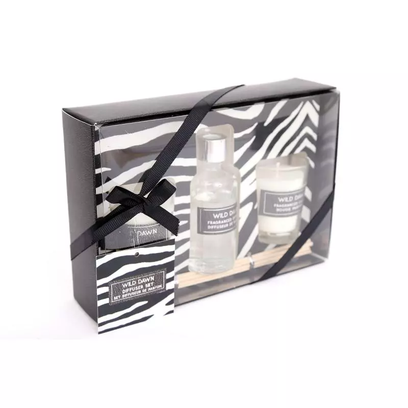- Zestaw prezentowy złożony z dyfuzora 40 ml i dwóch świec o zapachu poranku. Skład surowcowy: 40% szkło,30% wosk, 20% płyn zapachowy, 8% plastik, 2% ratan.