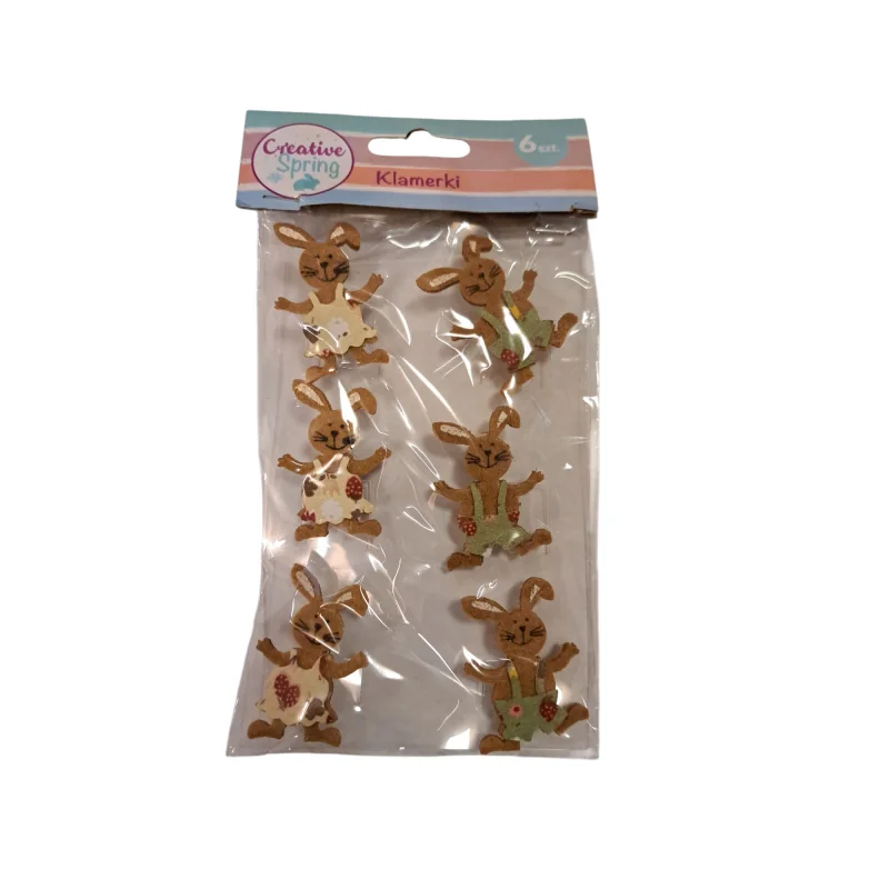 Blister zawiera 6 kolorowych króliczków z wysokiej jakości filcu, które mają przyczepione klamerki. Dzięki temu występowaniu się do ozdabiania kartek, albumów, zaproszeń, a także do zawieszania drobnych szczegółów lub zdjęć.