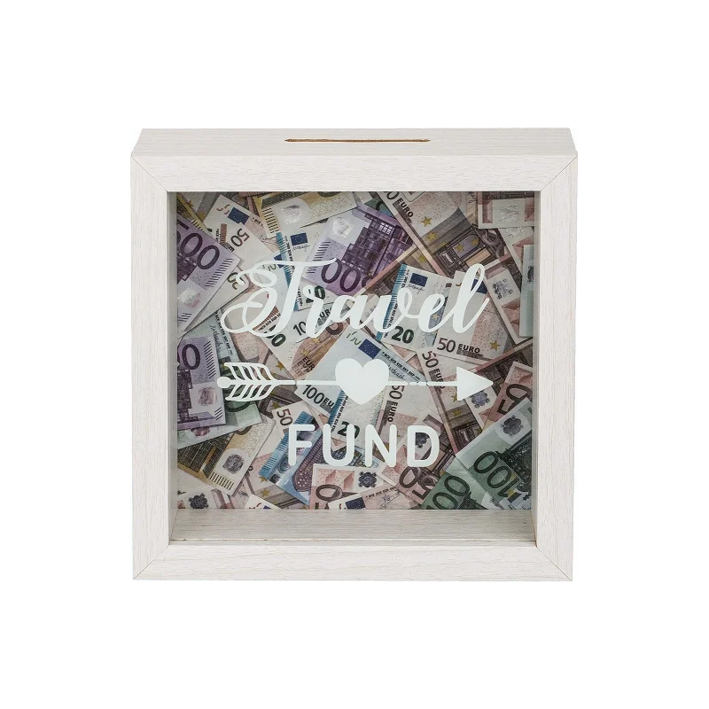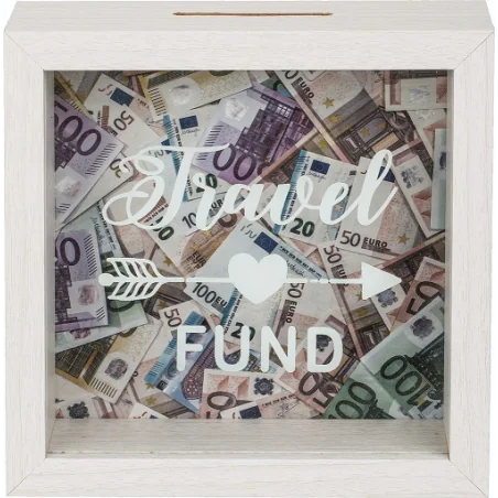 Napis na skarbonce głosi Travel Fund (zbiórka na podróż), co sprawia, że skarbonka idealnie się sprawdzi na mozolne zbieranie środków na upragniony wyjazd.