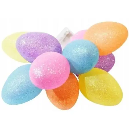 Ozdobne jajka wykonane ze styropianu w pięknych kolorach pokryte brokatem, idealne do wykorzystania jako dekoracja wielkanocna na stół, wystarczy postawić albo całość rozsypać między talerzami a zastawa od razu nabierze świątecznego wyglądu. Udekorujesz nimi też koszyczek wiekanocny.