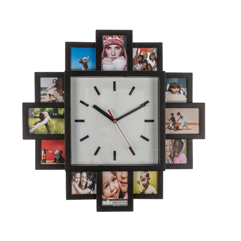 Zegar Ścienny z 12 Ramkami na Zdjęcia Czarny 38 cm to połączenie praktycznego czasomierza z elegancką i sentymentalną dekoracją wnętrza. Każda godzina to miejsce na Twoje wspomnienia – 12 ramek umożliwia umieszczenie zdjęć bliskich osób, podróży lub ważnych chwil. Idealny do salonu, sypialni, biura lub jako oryginalny prezent.