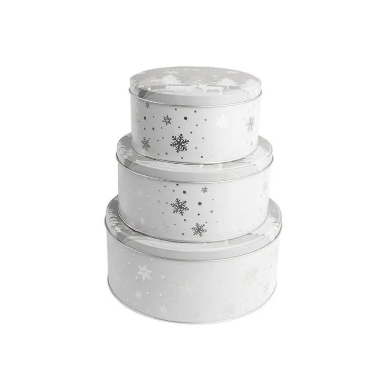 Puszki okrągłe komplet 3 sztuki dekorowane srebrne choinki Altom Design to elegancki zestaw metalowych pojemników, które łączą funkcjonalność z wyjątkowym, świątecznym stylem. Ich srebrny motyw choinek doskonale wpisuje się w klimat Bożego Narodzenia, a różne rozmiary pozwalają na praktyczne wykorzystanie w kuchni lub jako element dekoracyjny.