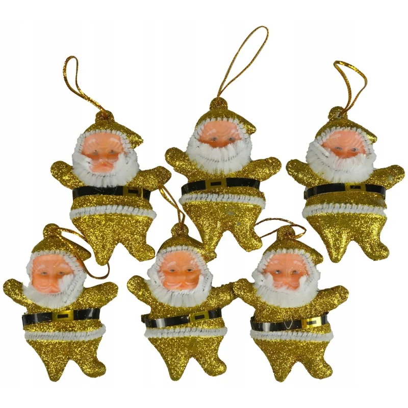 Zawieszki na choinkę Mikołaje złote brokatowe 6 szt. Arpex to błyszczący zestaw ozdób świątecznych, które nadadzą choince wyjątkowego, radosnego charakteru. Każda figurka Mikołaja została pokryta drobnym brokatem w kolorze złotym, dzięki czemu pięknie odbija światło lampek i tworzy ciepłą, świąteczną atmosferę.