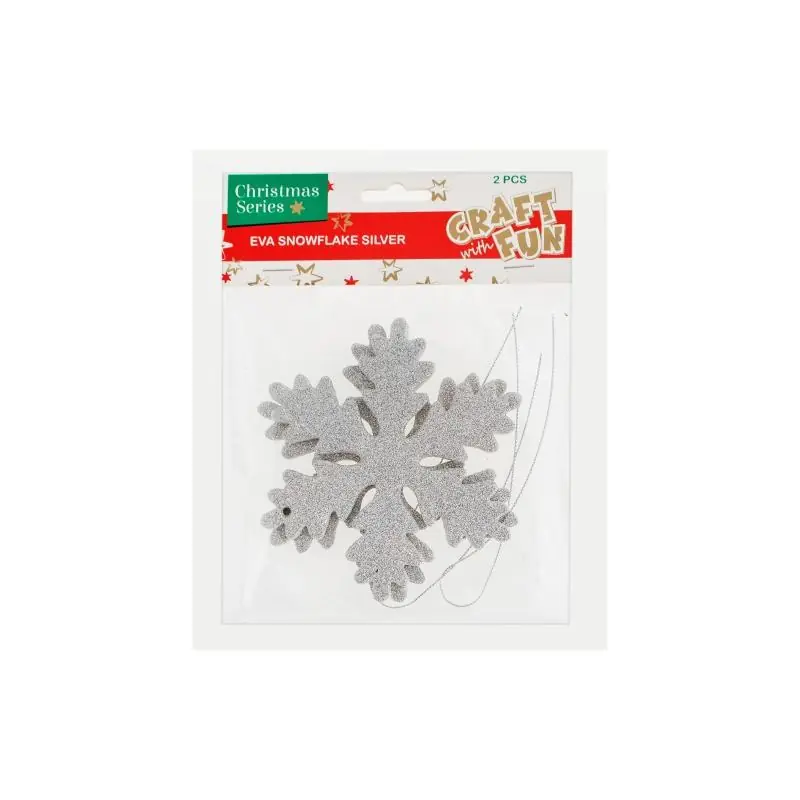 Craft with Fun Ozdoby dekoracyjne piankowe Płatek Śniegu zawieszka srebrna 2szt to eleganckie i lekkie dekoracje, idealne do ozdabiania choinki, stroików, okien i innych świątecznych aranżacji. Piankowy materiał zapewnia bezpieczeństwo w użyciu i łatwość zawieszania, a srebrny kolor dodaje blasku każdej dekoracji.