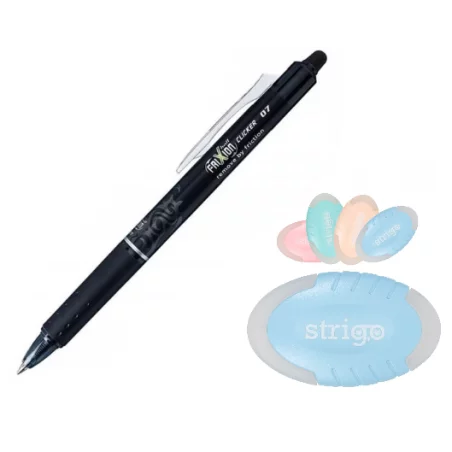 Napisz… usuń… popraw z automatyczną wersją pióra FriXion! . Napisany piórem Frixion tekst potrzyj dynamicznie szarą końcówką i zobacz jak znika w magiczny sposób! Możesz natychmiast poprawić swoje błędy i pomyłki. Tusz Metamo, wrażliwy na zmiany temperatury, został opatentowany przez Pilot'a. Dzięki niemu PILOT zrewolucjonizował rynek artykułów piśmiennych! . Opływowy kształt i dekoracyjny tatuaż sprawiają, że Frixion posiada swój młodzieńczy styl.